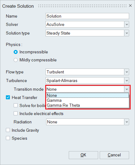 Enabling a turbulence transition model allows including the effects of flow transition from laminar to turbulent state. Two transition models namely a) Gamma and b) Gamma Re Theta are supported which are valid for the Spalart-Allmaras, Shear Stress Transport, Spalart-Allmaras DES (detached eddy simulation), and Shear Stress Transport DES turbulence models.