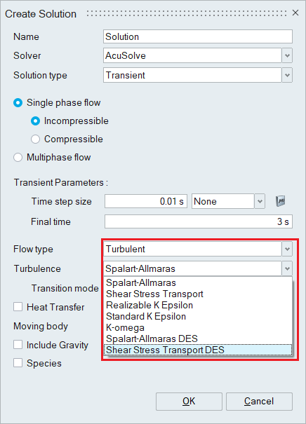 If Flow is set to Turbulent, Turbulence option is displayed. SimLab supports a variety of turbulence models such as Spalart Allmaras, Shear Stress Transport (SST), K-Epsilon and K-Omega. . It also includes Spalart Allmaras DES, and Shear Stress Transport DES for transient analysis. Depending on the problem being solved, an appropriate turbulence model needs to be selected.