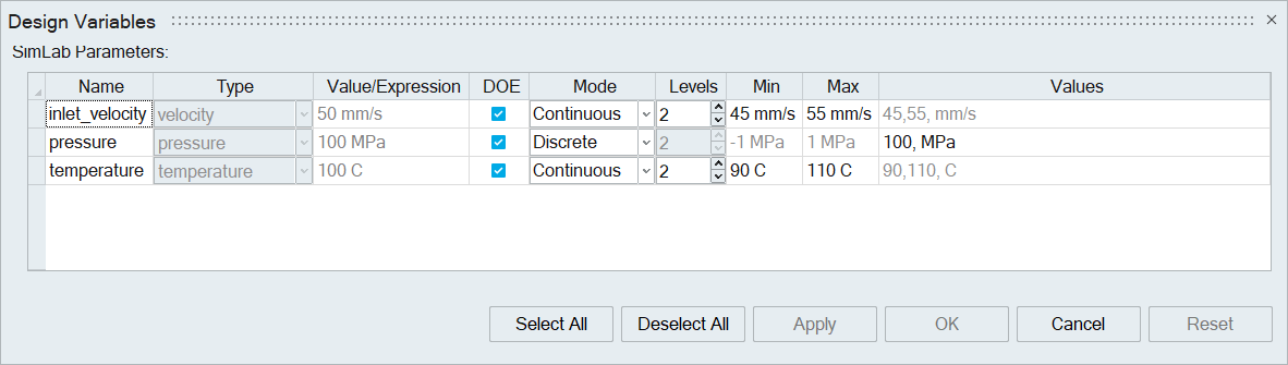 Double-clicking “Design Variables” in the DOE solution will list all the parameters that are associated with the solution and its coupled solutions. The “DOE” column in this table allows the user to select parameters that the user wants to include for experiments.