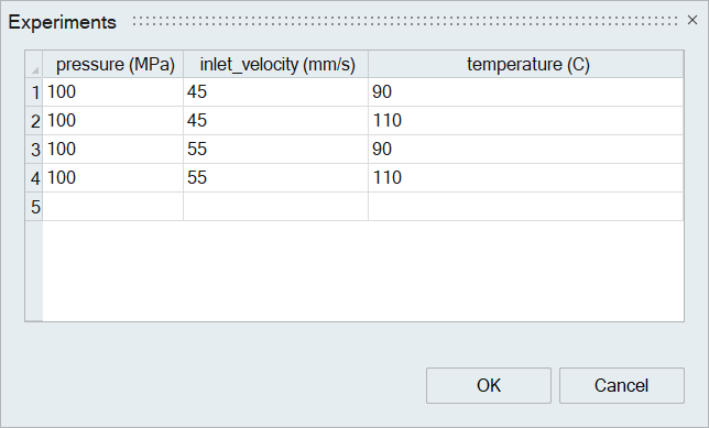 The experiments table can be displayed by clicking on “Experiments” in the Analysis ribbon. This will show a table with a set of experiments created based on the parameters defined. This table allows users to add/remove experiments and change the parameter value.