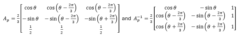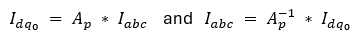 Park equation standard method (amplitude invariant) is used here, linking current in abc frame to current in the dq0 frame: