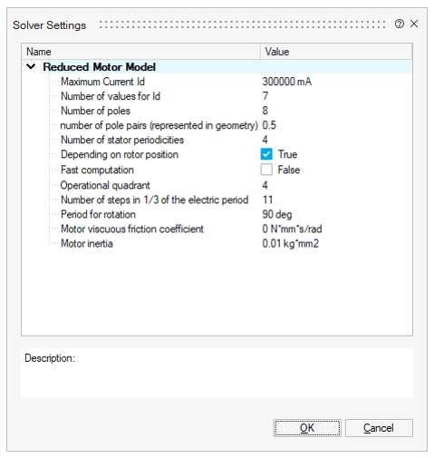 Solver Settings for this solution are current and position range for the look up table computation. The number of values for Id is for 4 quadrants, so setting 5 values on 1 quadrant will generate a vector of ID that has 3 values.