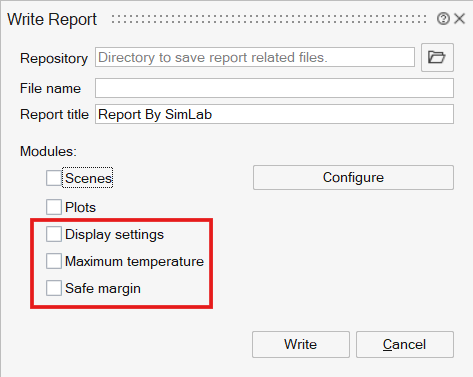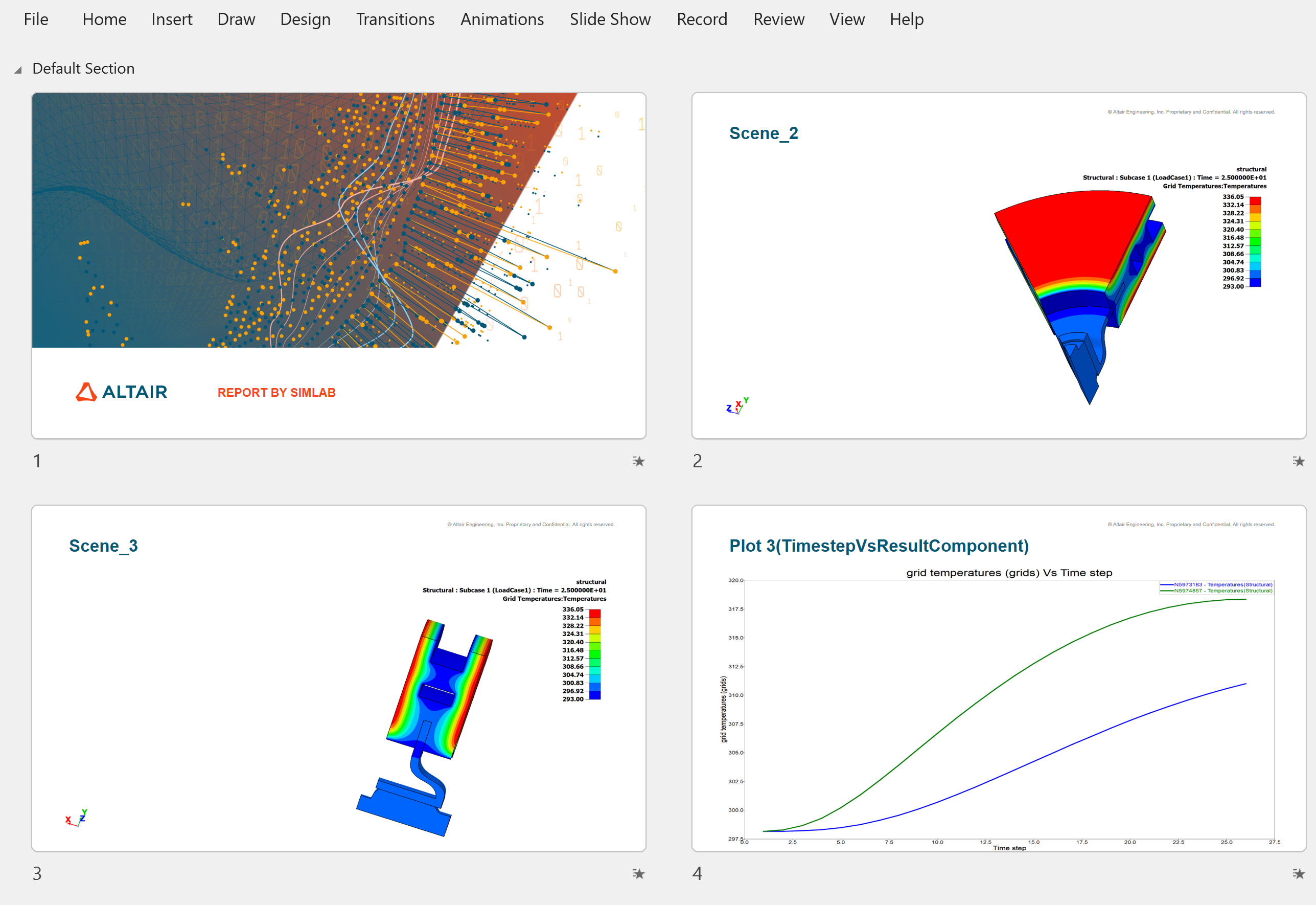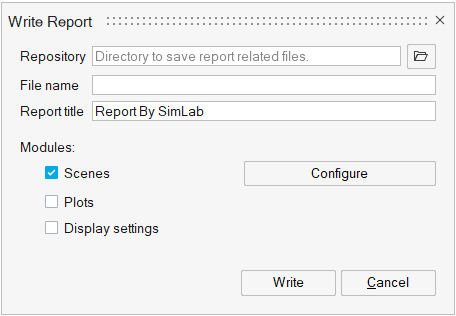 This tool is used to generate power point format reports for the modules in SimLab. Scenes, Plots and Display settings modules are supported for now.