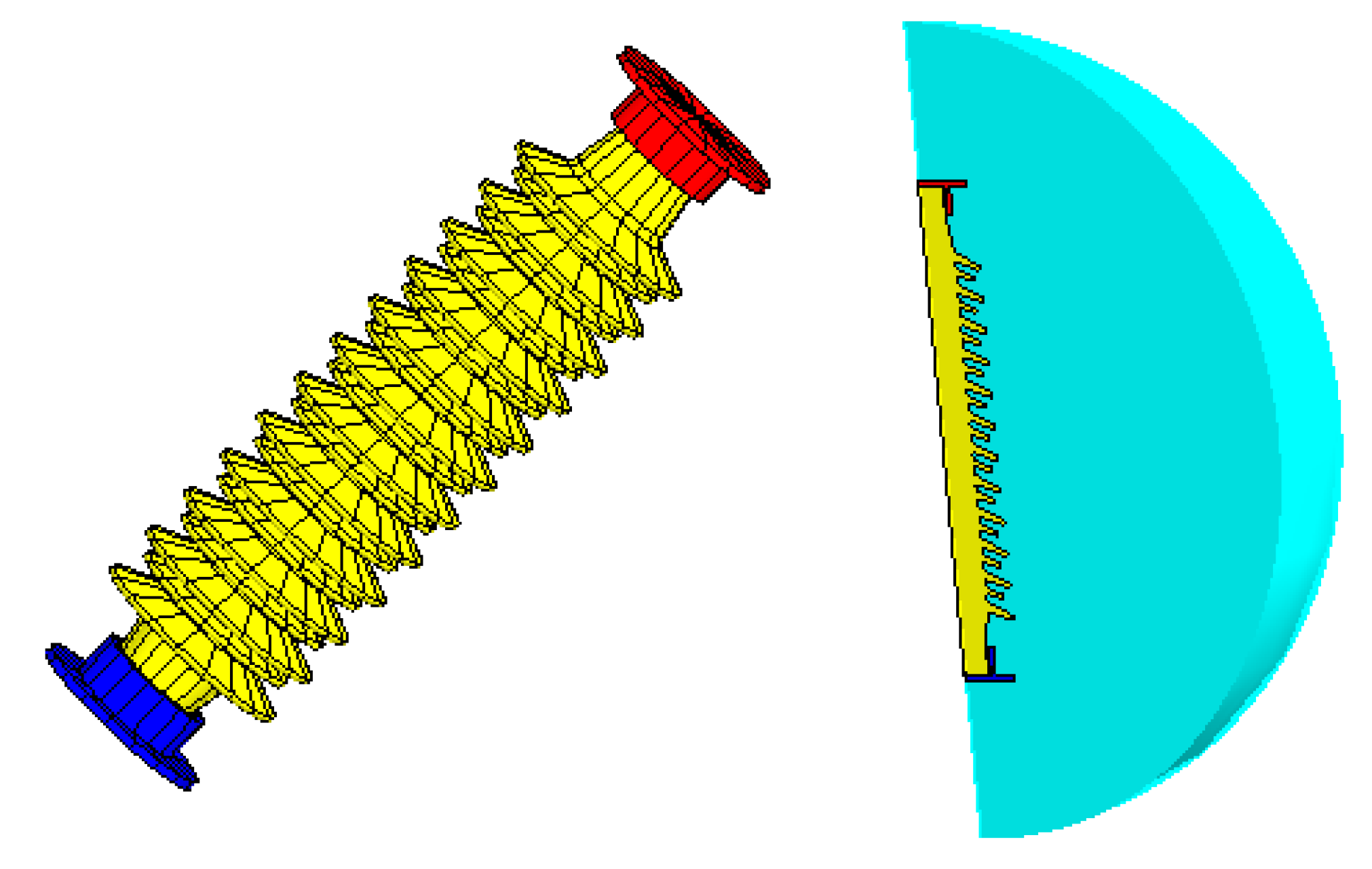The studied device is an insulator separating two conductors, one at high potential, and another one grounded. The device is in the air. The aim is to study ionized canals propagation (Streamers propagation) with "Streamer Criterion" Load. |