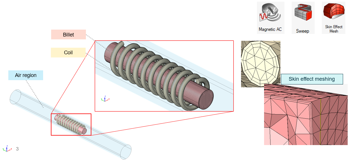 | 3D Magnetic AC | Forced cooling at the end of the heating | The studied device is composed of a mobile billet and a supply inductor. The goal is to simulate a forced cooling process at the end of heating (when the billet is out of the coil). | ![]() |