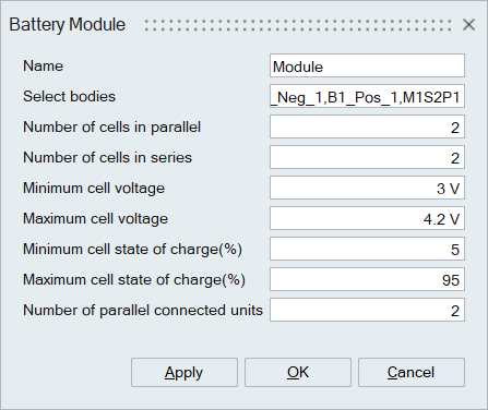 The Battery module is a hierarchical unit in the battery pack that is made up of cells arranged in serial and parallel. The command provides an avenue to identify electrical bodies that belong to the module as well as the datasheet operating limits of the cell. The operating limits supported in the battery solutions are the maximum and minimum individual cell voltage as well as the SOC range (i.e. maximum and minimum SOC).
