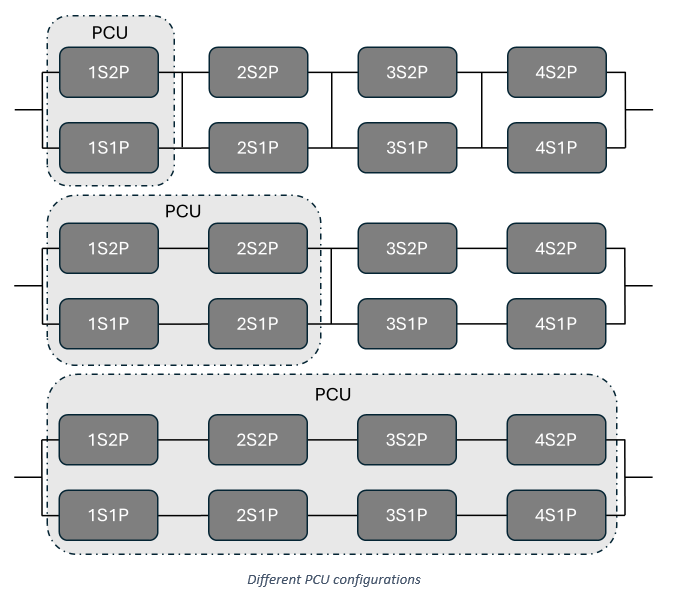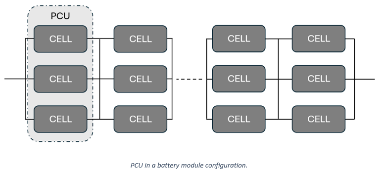 The number of parallel connected units (PCU) represents how cells are wired or connected in the module. This parameter only needs to be set when the state of charge differs between cells. Conceptually, a PCU in a module is given below.