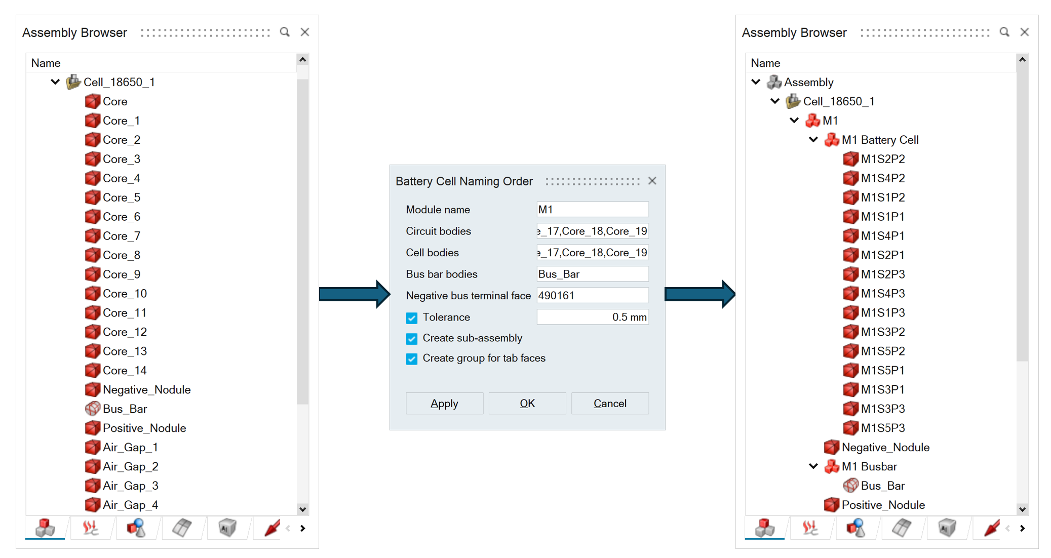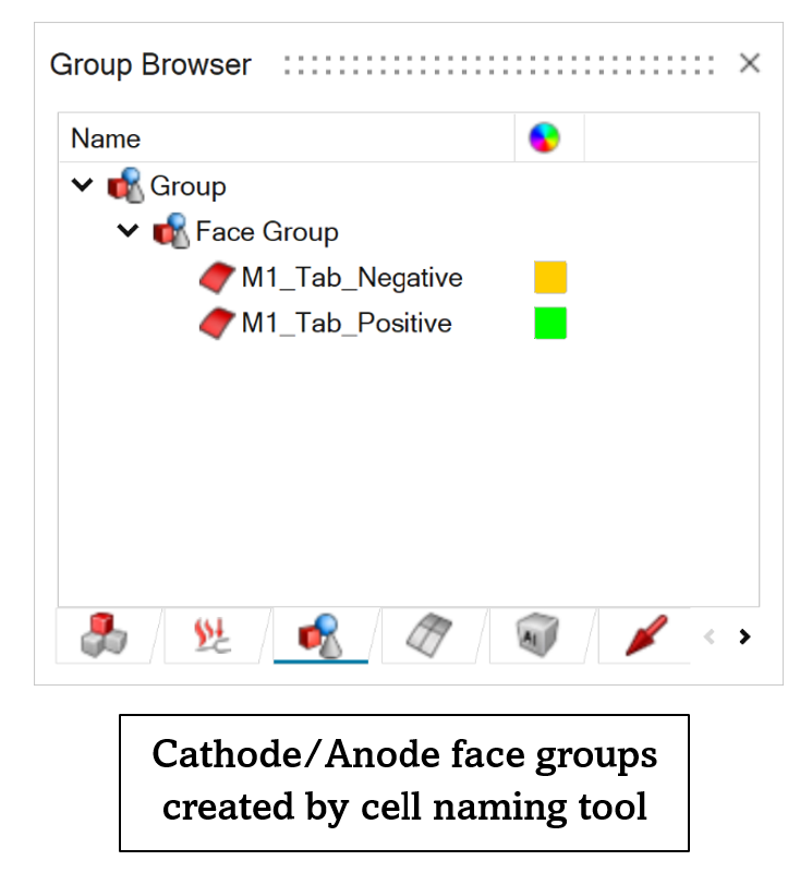 - Face group, “M#_Tab_Positive” contains cathode faces from all the cells in a module. Likewise, “M#_Tab_Negative” face group contains anode faces from all the cell in a module.