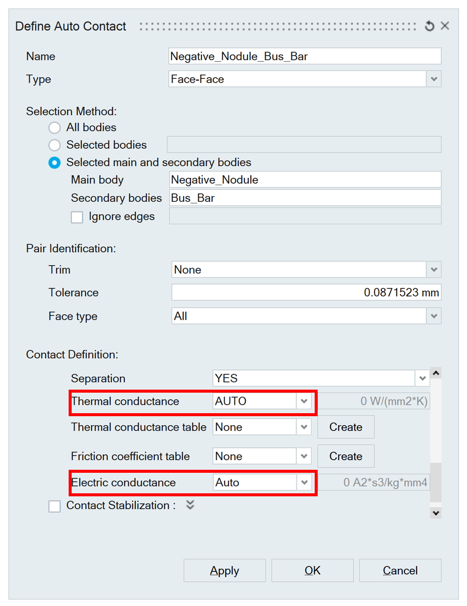 - Use contact tool to define electrical/thermal connectivity between non-connected bodies.