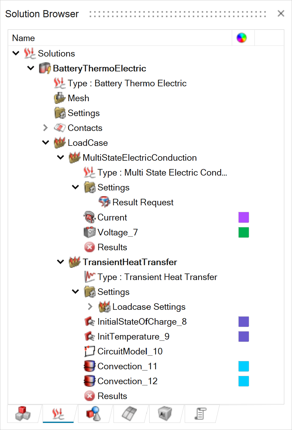 - (Loadcase 2) Transient Heat Transfer: contains the thermal loads and battery model.