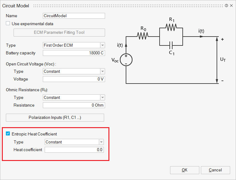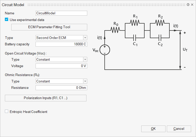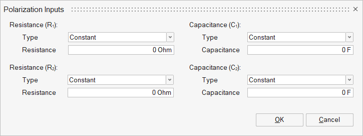 Polarization InputsPolarization resistance and capacitance in the ECM model, describe the dynamic behavior of the battery (e.g. ion transport and charge transfer).