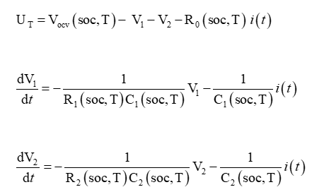 Where is the terminal voltage, soc is the state of charge, T is the temperature, is the open circuit voltage, is the ohmic resistance, and are the polarization resistances of the first and second RC pairs respectively. and are the polarization capacitances of the first and second RC pairs respectively, is the input current, and t is the time.