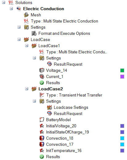 - Battery thermal analysis can be performed using Multi State Electric Conduction Solution with a Transient Heat Transfer Loadcase.