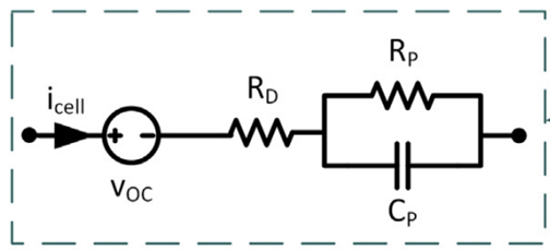 ECM represents the electrical behaviour of the battery cell in terms of voltage, current, resistances, and capacitances. Each battery cell is modelled as an ECM.