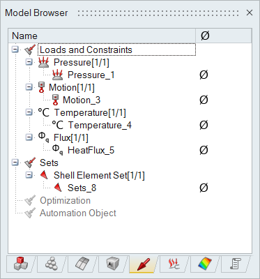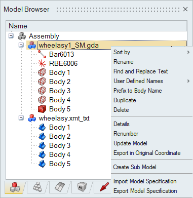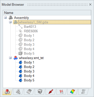 The Model Browser provides hierarchical views for all the model data (such as Bodies, Assembly structures, Material, Property, Mesh Controls, Solutions, Loads and boundary conditions, Results components, and Parameters)