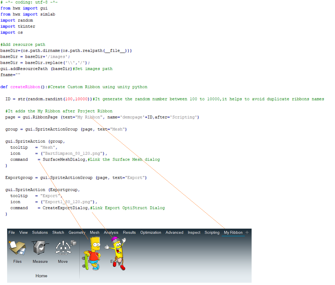MyRibbon.py contains the script to create ribbons, sprite actions and linking to functions.