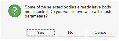 Quick mesh settings can be defined using mesh control or mesh parameters. When assigning mesh parameters and the body already has mesh control, a message gets prompted to overwrite or retain the current settings.