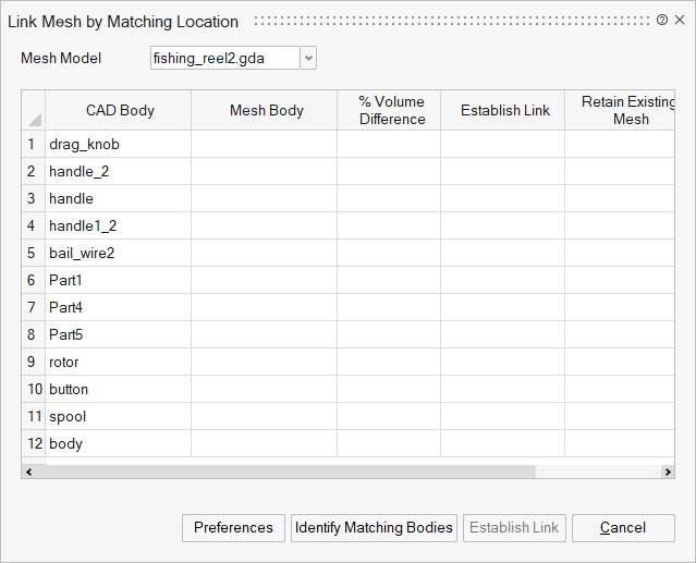 This tool assists in identifying nearby mesh bodies that can possibly be linked to the selected CAD body. It provides a list of mesh bodies based on proximity, allowing the user to review and manually establish links between the CAD body and the appropriate mesh body.