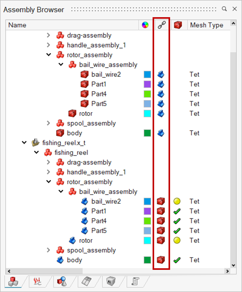 By default, the Establish Link toggle is ON for all identified matching bodies. Users can toggle off the unwanted association. This option creates a link between the CAD and its mesh bodies. In the browser, the link column shows the icon for the CAD and its associated mesh bodies. Click this icon to get its associated body.