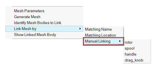 This option allows linking the selected CAD body to a non-linked mesh body. All the available mesh bodies not linked to CAD bodies get listed in the context menu, and the user can choose the appropriate body to establish the link.