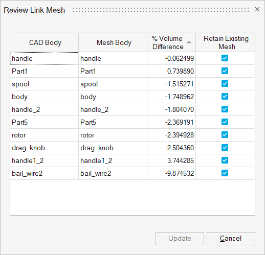 % Volume Difference shows the difference in volume between the CAD body and its associated mesh body.