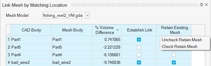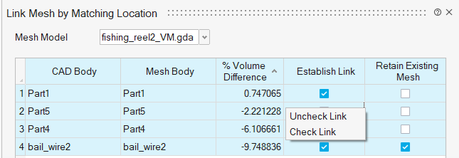 When selecting multiple rows, the user can toggle the 'Establish Link' and 'Retain Existing Mesh' options on or off using the right-click menu for the selected rows.