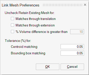 The Preferences option allows you to set rules for automatically detecting parts that require a new mesh. These rules are applied during the identification of matching bodies, and the 'Retain Existing Mesh' toggle is set accordingly for the parts.