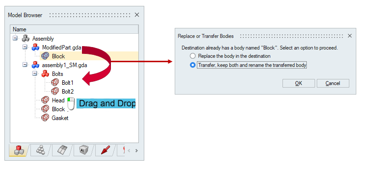 When we drag and drop across the model, if there exists a body with the same name, it will show an option to replace or transfer. Based on user preference, it will do the operation.