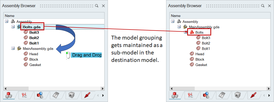 The model browser supports drag-and-drop operations for bodies/sub-models/models. Drag and drop can be done within or across the model.