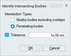 Intersecting faces display supported for the ‘Nearby bodies’ option and the ‘Penetrating bodies’ option without tolerance input.