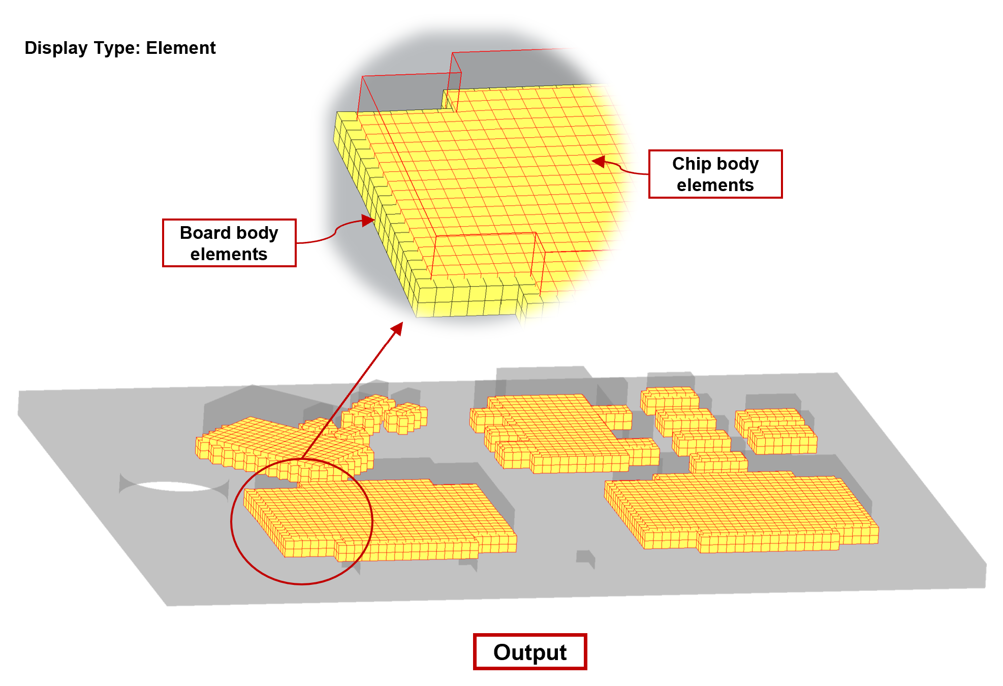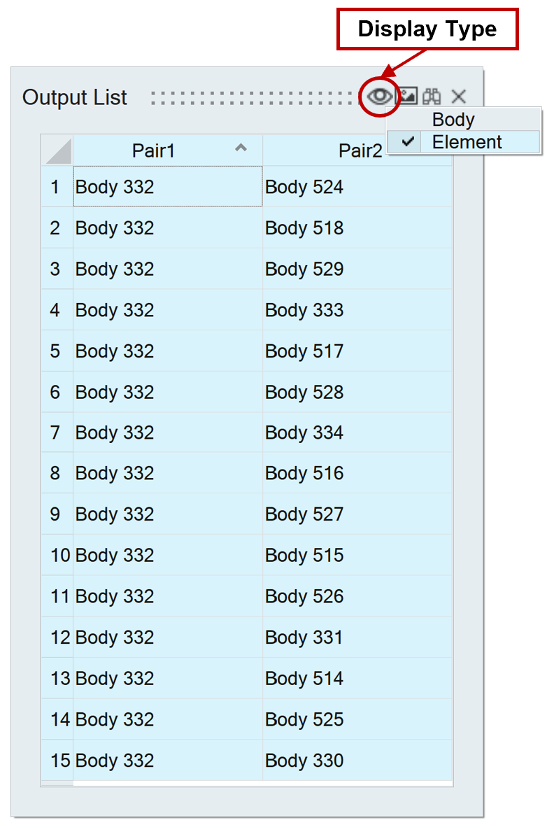 Identify Intersecting Bodies tool adds the found intersecting bodies to this output list. Users can visualize the entities like body, face, and element in the intersecting region by switching the options in the ‘Display Type’ as shown in the figure below.