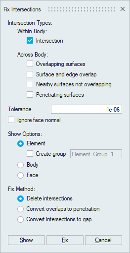 Intersecting elements display supported only for the ‘Penetrating bodies’ option with tolerance input.