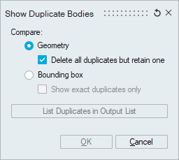 Show Duplicate tool adds the found bodies to this output list. We can verify and delete unwanted bodies.