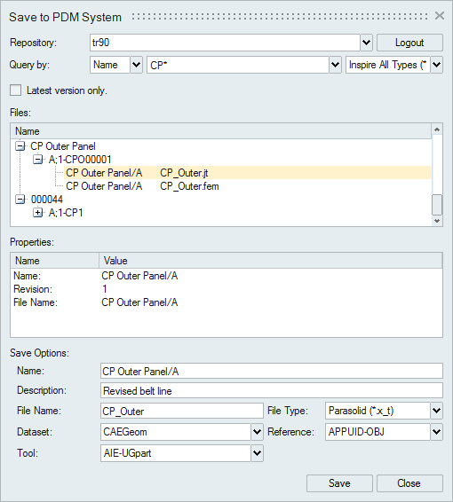 - To save over an existing file, select the file. If the selected file name already exists in the PDM system, the version in the PDM system will be overwritten.