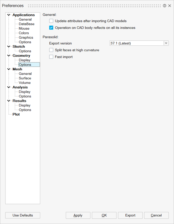 The export version for Parasolid files can be selected using this option. The latest version is the default option.