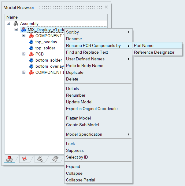 Model > Right Click > Rename PCB Components by