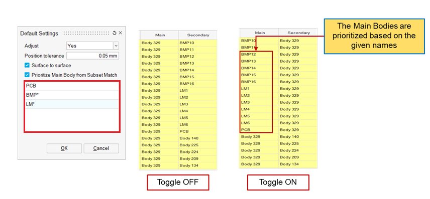 By default, body with a larger volume is considered as the main body. Right-clicking on the cell pops up a menu Swap Main/Secondary to swap the main body.