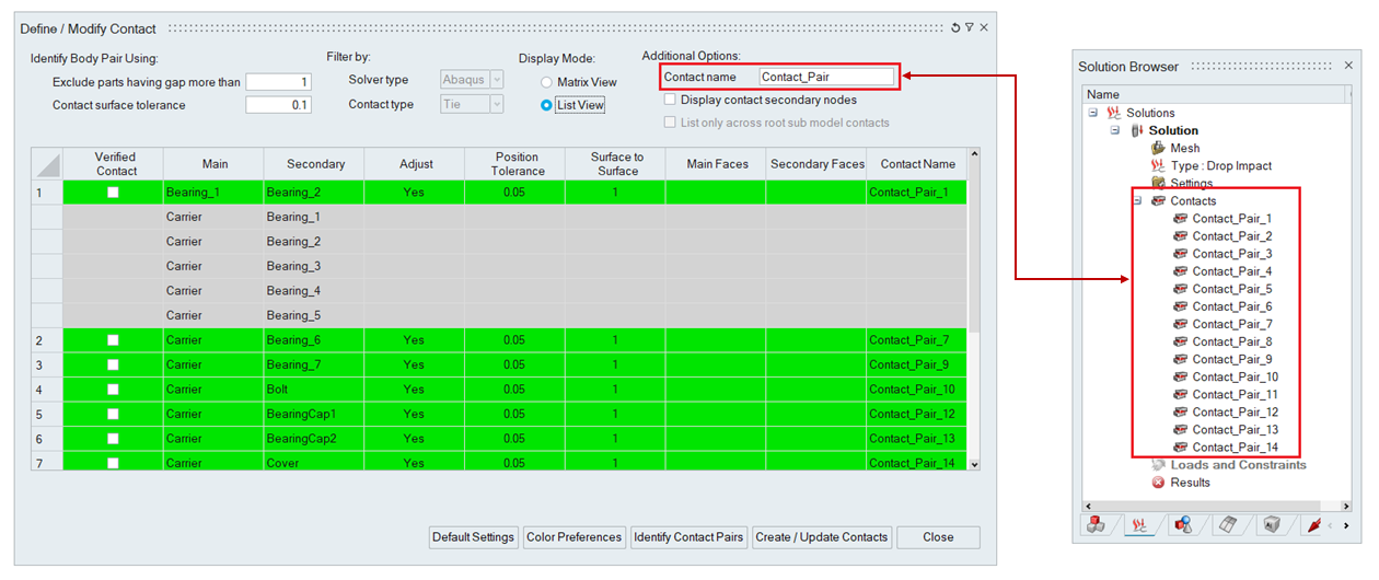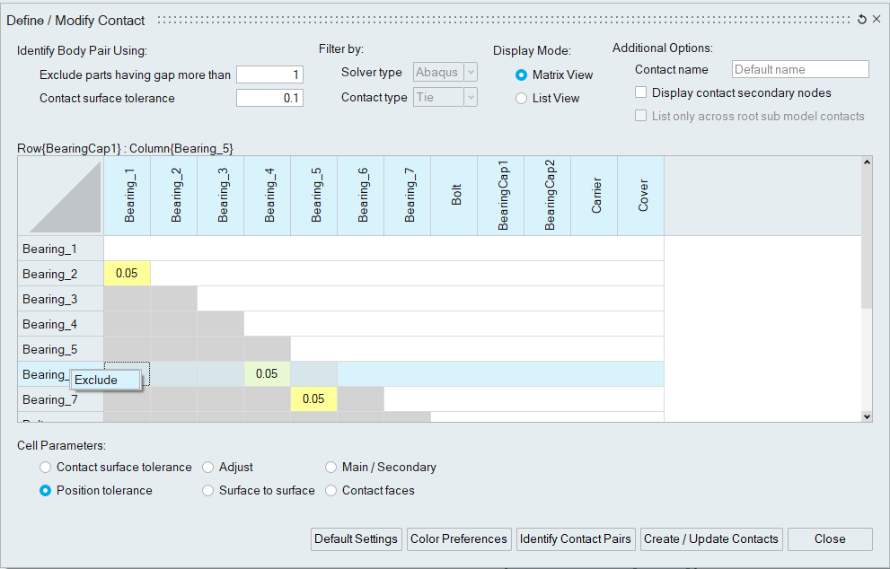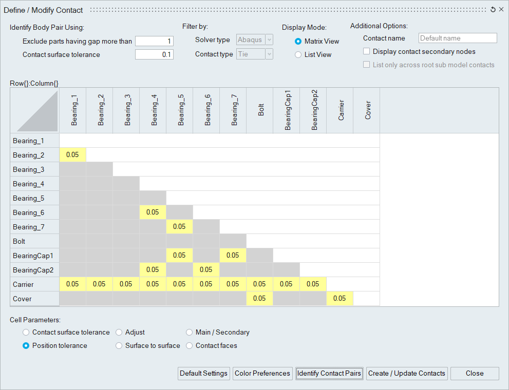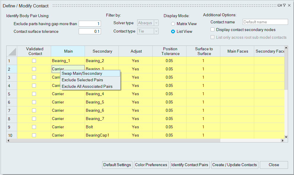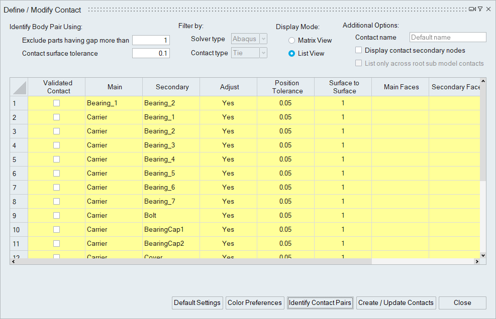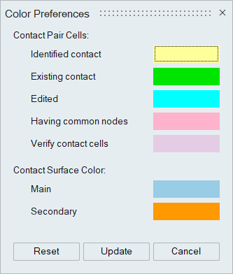 The table cells in the contact display are highlighted with distinct colors to differentiate between newly identified contact pairs, existing contacts, edited cells, body pairs with common nodes, and body pairs without secondary nodes for the specified position tolerance. Users can customize the default colors by adjusting their color preferences. Additionally, they can set display colors for main and secondary bodies that will be displayed when clicking on the respective cells.