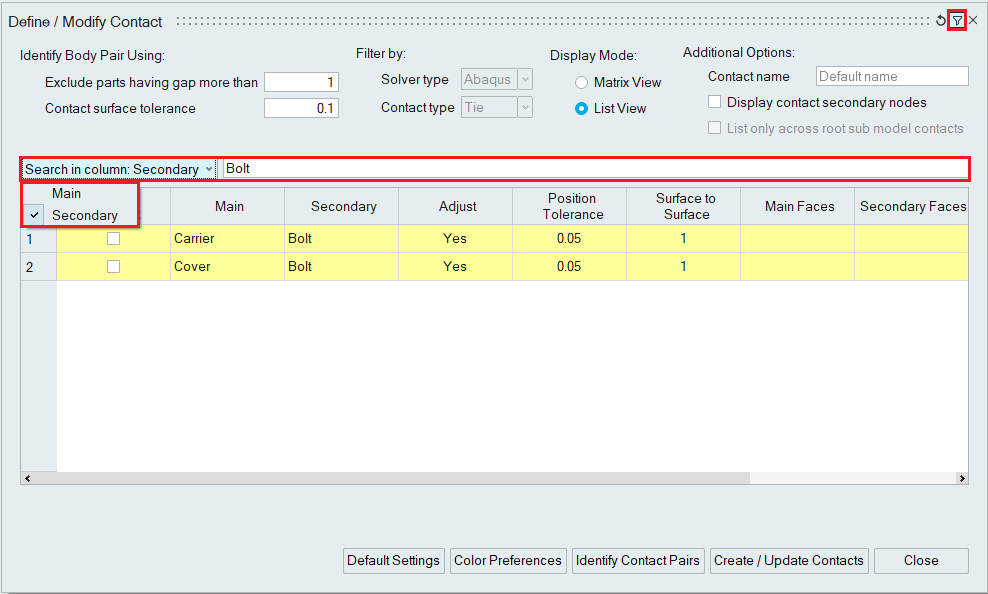 This option filters the listed contact pairs using Main / Secondary body names.