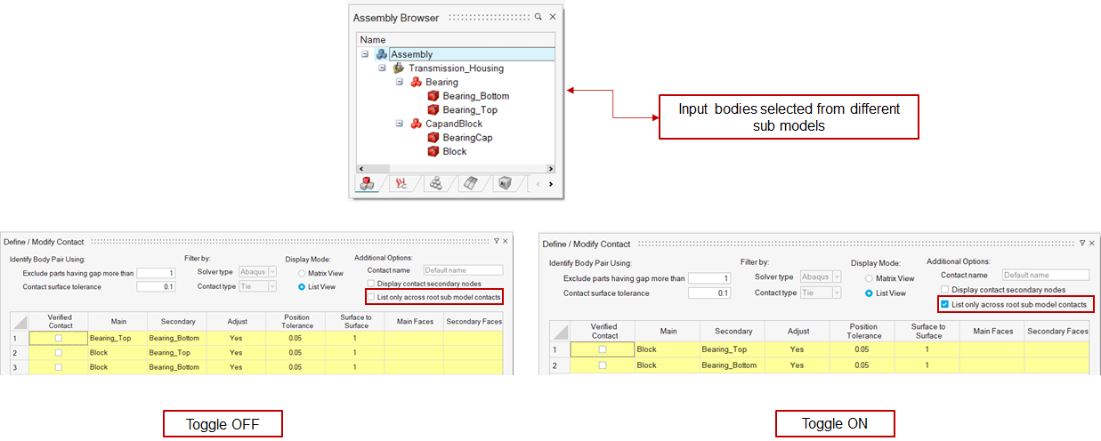 Usually, the contact pairs are identified and displayed for all the selected bodies. Turn this toggle ON to get/identify only the contact pairs across first-level sub-models alone for processing.