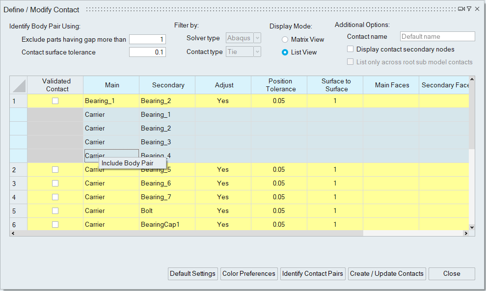 This option allows visualizing the contact body pairs in the matrix or list view.