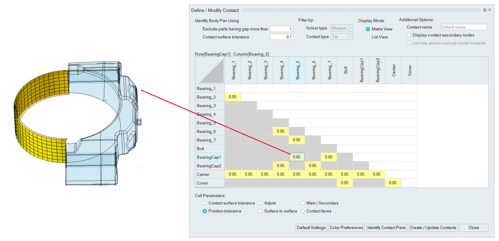 The headers of the cell are labeled using body names. Clicking on the cell displays the body pair names at the top of the table. Also, it shows the contact surfaces for that body pair.