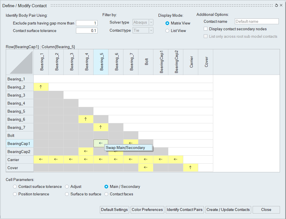 Click on the Main/Secondary cell to see the contact surfaces of the body pair.