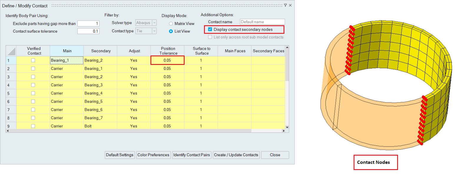 This toggle displays the nodes of the secondary body that is in contact with the main. If the position tolerance is modified, the nodes will get automatically updated.