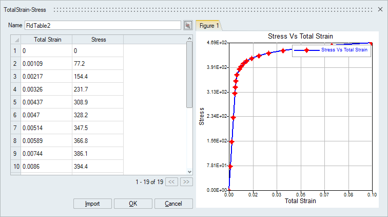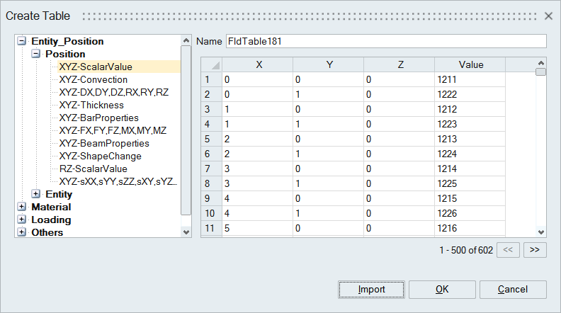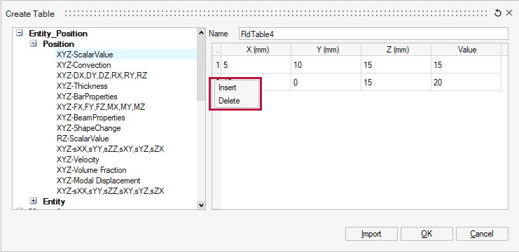 - Table Type: Left side panel will list all the table type supported and it will depend on the source from where this dialog is launched. For Example: Pressure supports (XYZ Vs value) or (Frequency/Time Vs value) and Material's Youngs Modulus field will support (Stress,Strain,Temperature) input.