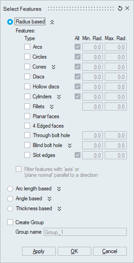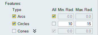 The features (Arcs/Circles/Cones/etc.,) that can be identified are listed. You can choose the types that you want to identify.