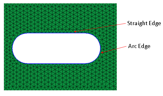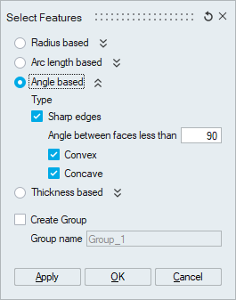 Slots are formed when two arc edges are connected with two straight edges. Slot edges present in planar faces can be identified using this option. Minimum and maximum radius value can be used to identify slot edges within a radius range of the arc edge.