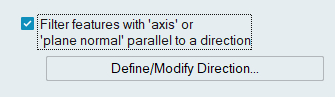 This option finds the features whose axis or normal lie along the given direction. The filter is applicable for Arcs, Circles, Cones, Discs, Hollow Discs, Cylinders, Planar faces, Through bolt holes, and Blind bolt holes.