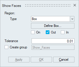 If all the nodes of a face and centroid of all the elements of a face are lying outside of the defined box and (d > Tol), then that face will be displayed using the Out option.If all the nodes of a face and centroid of all the elements of a face are lying inside of the defined box and (d > Tol), then that face will be displayed using the In option.