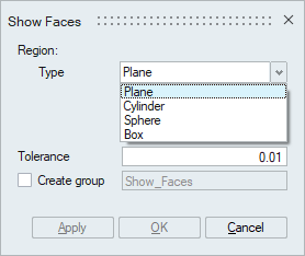 This option works for the selected FEM/CAD bodies or faces. The faces will be displayed based on the defined region (Plane/Cylinder/Sphere/Box)